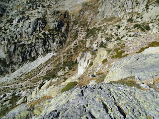 encuentro del Desagüe del Ibón de Coanga para alcanzar por la ladera vestida de placas graníticas fuera de la